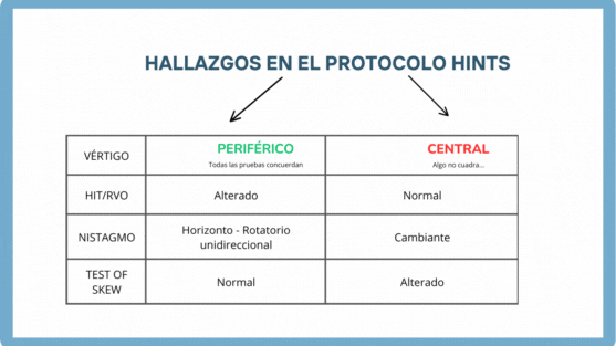El protocolo HINTS tiene una sensibilidad (99%) y especificidad (97%) mayor que la RMN para poder diagnosticar un vértigo central. La RMN realizada en las primeras 24-48h para diagnosticar un vértigo central tiene una sensibilidad del 86.7% (79.5%-92.1%)